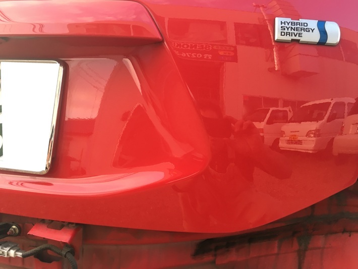 TOYOTA AQUA バックドア 塗らない鈑金 デントリペア TOYOTA アクア バックドア 塗らない鈑金 デントリペアこれもまた交換レベルの損傷ですが、セノキモータース独自の工法で条件が合えばこのようにリセットしたかのようにヘコミが無かった時の状態に戻す事が可能です。